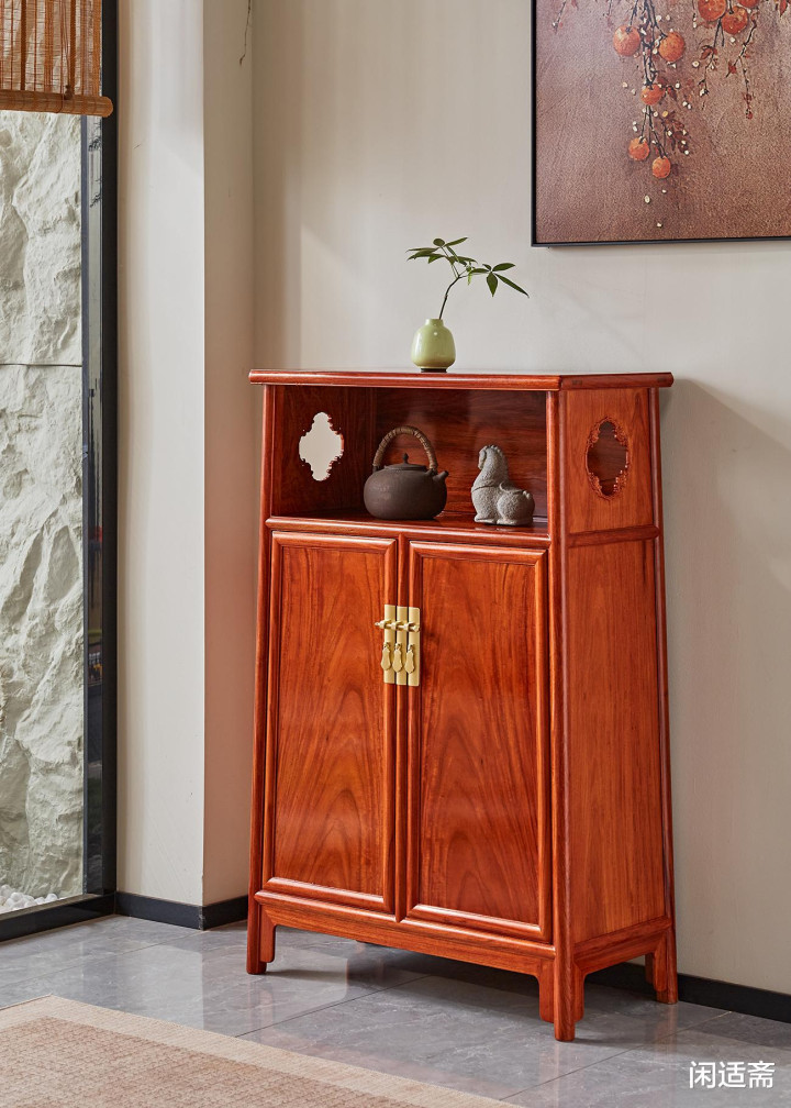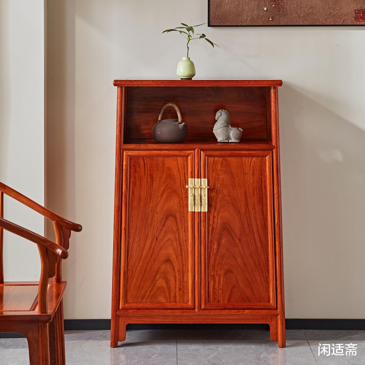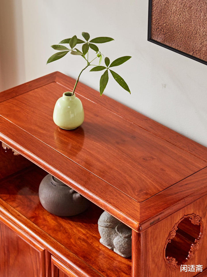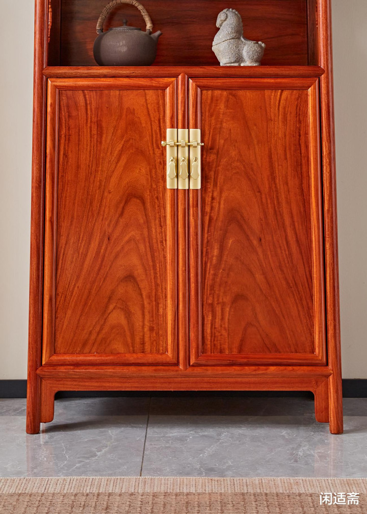此柜通体甄选优质缅甸花梨木打造,木色醇厚雅致,呈黄褐色至红褐色渐变,肌理间可见清晰的水波纹、虎皮纹等天然纹路,独一无二且极具观赏性;木材自带淡淡的檀木清香,轻嗅便能感受雅致韵味,兼具安神静心之效。