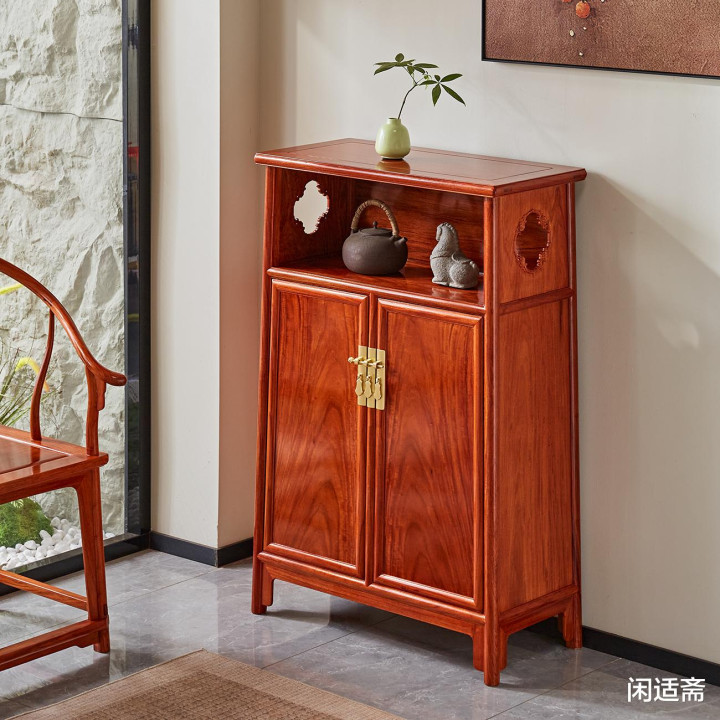 四足外撇,腿足间装有素面刀牙板,刀牙板线条简洁利落,无过多繁复雕饰,既起到加固柜体结构、提升承重稳定性的作用。整器圆角设计贯穿始终,边角圆润顺滑,既避免了尖锐边角的磕碰隐患,又让柜体线条更显温婉流畅,契合中式美学中“圆融雅致”的核心追求。
