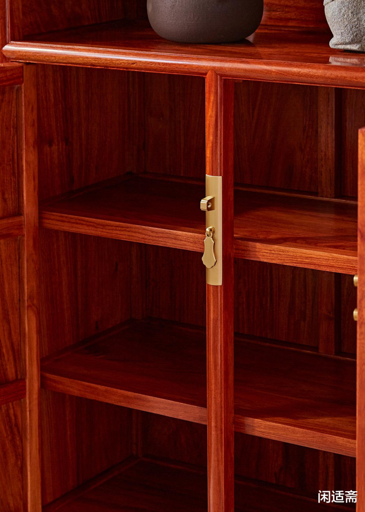 柜体采用经典亮格造型,上部亮格设计,便于陈设古玩、雅瓷、古籍等藏品,让器物之美与柜体雅韵相互映衬;两侧巧妙开窗并采用海棠口造型,海棠花形线条圆润流畅,打破了柜体的规整沉闷,增添了灵动雅致的气息,同时也让柜体通透感十足,避免了封闭空间的压抑感。